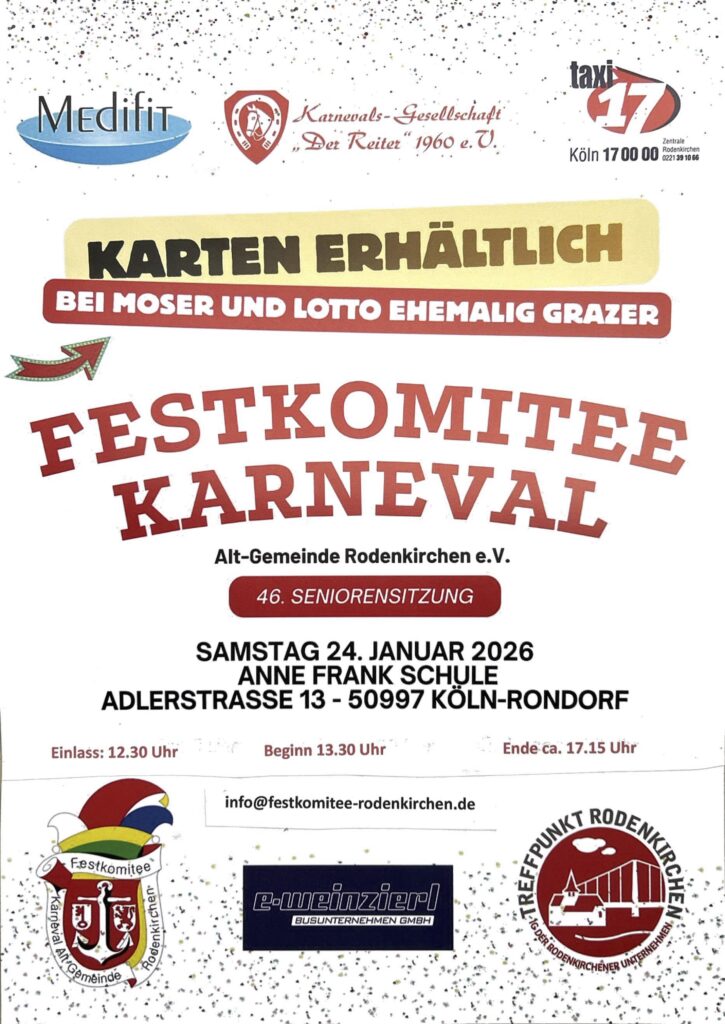 Die 46. Seniorensitzung 2026 des Festkomitee Karnveal der Alt-Gemeinde Rodenkirchen 1973 e.V. und der KG „Der Reiter“ 1960 e.V. findet am Samstag, den 24.01.2026 in der Sporthalle der Anne-Frank-Schule, Adlerstraße 13, 50997 Köln, statt. Einlass ist ab 12:30 Uhr, die Veranstaltung beginnt um 13:30 Uhr.