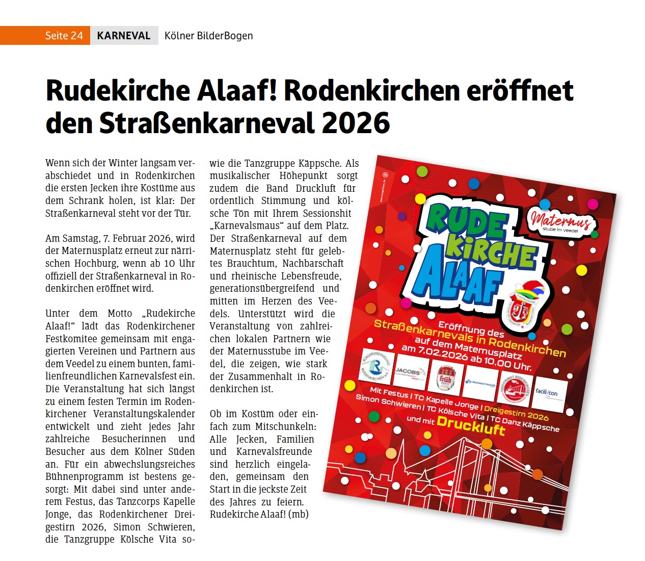 Am Samstag, 7. Februar 2026, wird der Maternusplatz erneut zur närrischen Hochburg, wenn ab 10 Uhr offiziell der Straßenkarneval in Rodenkirchen eröffnet wird. Unter dem Motto „Rudekirche Alaaf!“ lädt das Rodenkirchener Festkomitee gemeinsam mit engagierten Vereinen und Partnern aus dem Veedel zu einem bunten, familienfreundlichen Karnevalsfest ein.